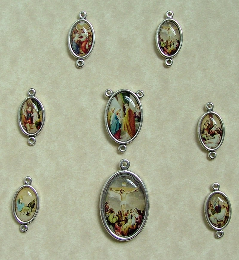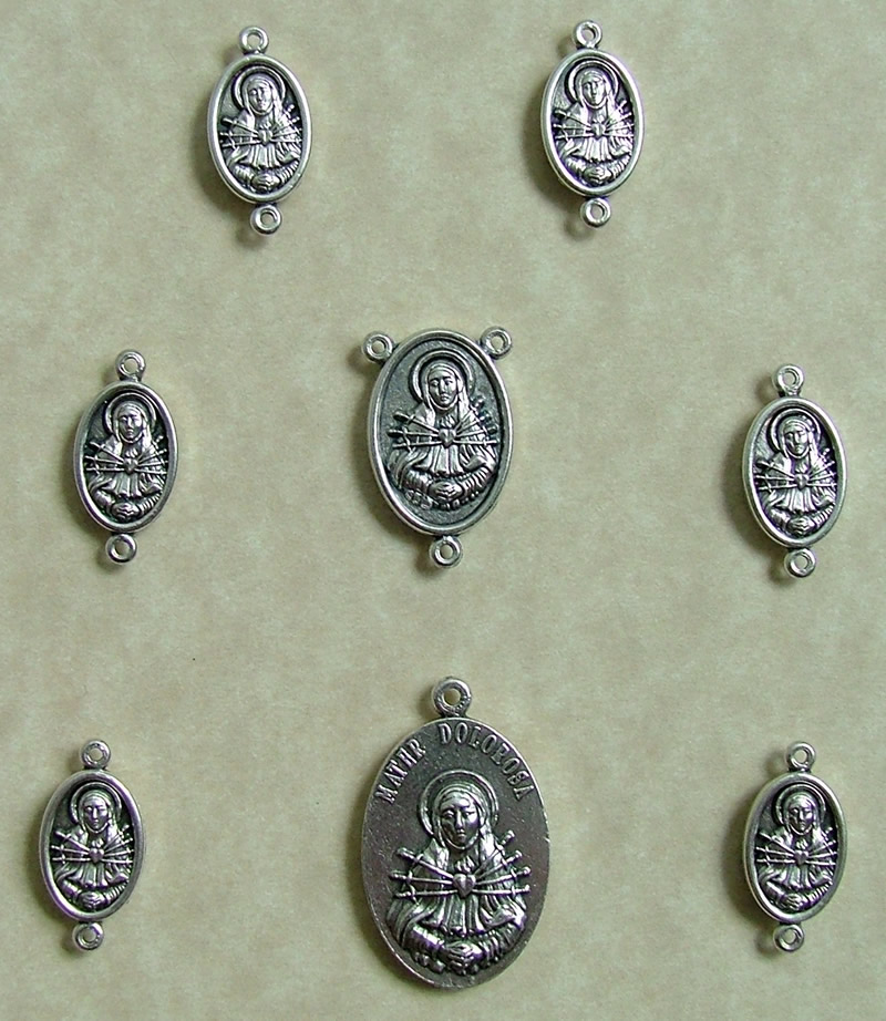 The Seven Sorrows Chaplet is for meditation on the seven sorrows of Mary. The Seven Sorrows Chaplet is made of seven sets of seven beads. The beads we have chosen are garnet Czech fire polished glass beads. Each set of beads is separated by a medal with a detailed picture of the sorrow being reflected on. Instead of a crucifix the Seven Sorrows Chaplet has a large medal depicting the crucifixion. This handmade Seven Sorrows chaplet costs $50